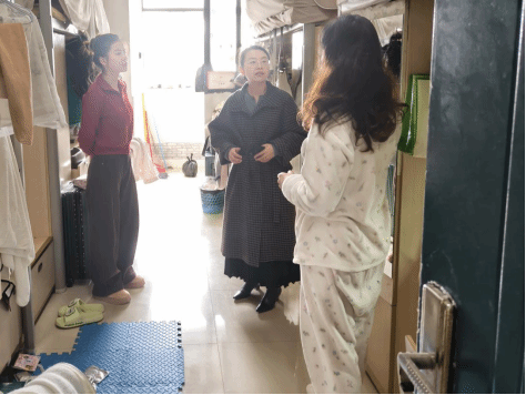 走访过程中,辅导员们与同学们亲切交谈,详细询问大家的假期生活及新学期的准备情况。从假期里的社会实践、家乡年味,到新学期的课程安排、考研就业打算,再到寝室的生活设施、卫生状况,老师们都细致关切,认真倾听同学们的心声。在温馨的氛围中,辅导员们也不忘为同学们敲响新学期的“警钟”。针对寝室安全,重点强调了用电规范、防火防盗等注意事项,提醒大家及时排查寝室安全隐患;针对学业发展,鼓励同学们尽快调整作息状态,收心归位,制定清晰的新学期目标,珍惜时光、勤奋学习;针对心理健康,叮嘱大家关注自身情绪变化,主动与老师、同学沟通,学院永远是大家坚强的后盾。